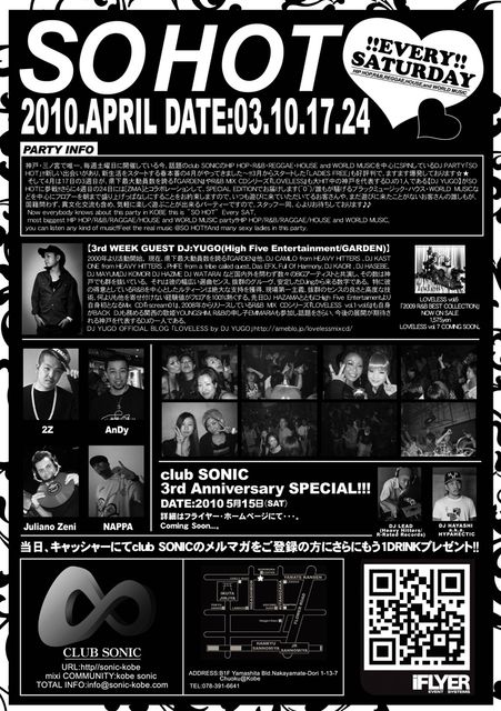 Now everybody knows about this party in KOBE this is ”SO HOT” Every SAT, most biggest HIP HOP/R&B/RAGGAE/HOUSE and WORLD MUSIC party!!HIP HOP/R&B/RAGGAE/HOUSE and WORLD MUSIC, you can listen any kind of music!!Feel the real music @SO HOT!!And many sexy ladies in this party.