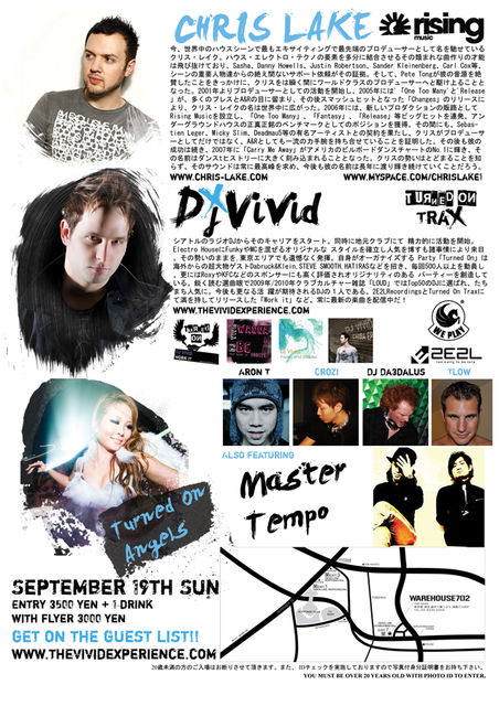 そんな、Sexy Party ”TURNED ON"が3年目を迎える今、新たなるSexyなイベントを最もHOTなWarehouse702にて、世界中から敬われる DJでもありプロデューサーでもある、”Carry Me Away", "Changes"など数々のヒット曲をだしたCHRIS LAKEと、最近リリースされたSexyでHOTなアルバム"Turned On Trax"、"2E2L"のレジデントDJ VIVIDがダンスフロアーを熱くSEXYに盛り上げていく!!!! LocalゲストDJのAron T, Crozi, Master Tempo, Tlow, G Smidj、Da3dalus そしてTURNED ON エンジェルスのゴーゴーダンサーもSEXYにダンスフロアーを狂わせること間違いなし!この熱さについてこれるか?!