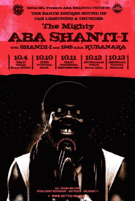 Zettai-Mu Presrnts ABA SHANTI-I TOUR’08 2008.10.4-13 UKs No.1 DUB SOUND SYSTEM 『 ABA SHANTI-I 』 1年半ぶりの来日!! ROOTS&CULTURE、DUBの聖地 ROOTS REGGAE シーン最大のダン〈UNIVERSITY OF DUB〉と毎年夏に開催される世界最大のウェストインディーズ・カーニバル〈NOTTINGHILL CARNIVAL〉のオフィシャルサウンドシステム『 ABA SHANTI-I 』 感動のJAH WORKS!!