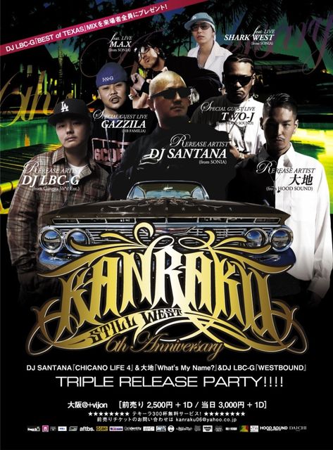 NEW MIX CD『CHICANO LIFE 4』をリリースしたばかりのLATIN、CHICANOシーンのカリスマDJ SANATANA! 今年HOOD SOUNDより待望のソロ・デビュー『What's My Name?』をリリースした大地! そして関楽のオーガナイザーでNEW MIX『WESTBOUND』が好評なDJ LBC-G! のトリプルリリースPARTYを開催します。