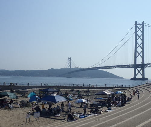 右手に明石海峡大橋、左手には美しい砂浜と綺麗な海が広がる景勝地