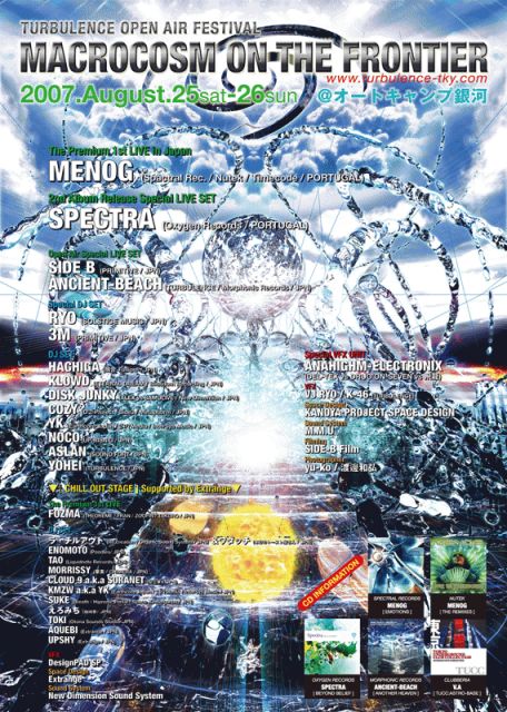 ■DJ SET ラ・チルアウト(Re.creation / Organic Sound System / JPN)&ワダッチ (本日のトースト屋さん / JPN) Enomoto (Poodles / JPN) tao (Liquidnote Records / JPN) morrissy (華美 / CHIMERA / JPN) Cloud 9 a.k.a Soranet (優曇華 / JPN) KMZW a.k.a YK (Earthcore Japan / 24/7Media / InterSys Music / JPN) SUKE (Breath / Hipnotic Portal / Space Kindergarten/ JPN) えろみち (加納家 / JPN) Toki (Otona Sounds Studio/ JPN) Aquebi (Extrange / JPN) upshy (Extrange / JPN)