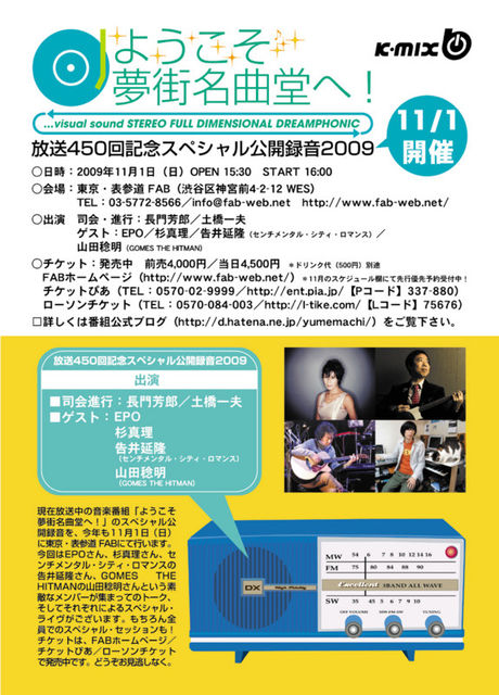 2001年からK-MIX(静岡エフエム)で放送を続けている音楽番組「ようこそ夢街名曲堂へ!」の、恒例となりました公開録音イヴェントを今年も11月1日(日)に東京・表参道 FABにて開催致します。今回は通算放送450回記念としまして、EPO/杉 真理/告井延隆(センチメンタル・シティ・ロマンス)/山田稔明(GOMES THE HITMAN)の4組をゲストにお迎えし、レギュラー陣とのスペシャル・トーク、そしてこの番組ならではのアコースティック・ライヴの2本立てを予定しております。もちろん、お楽しみのスペシャル・セッションも!GOMES THE HITMANの作品をかつてプロデュースした杉真理と山田稔明の共演も見られるかも知れません。どうぞお見逃しなく! 現在、表参道 FABホームページにて優先先行予約受付中、チケットぴあ・ローソンチケットでも発売中です!