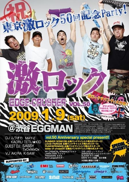 ★★★★★★★新年一発目の激ロックは50回記念祭!!★★★★★★★ LINKIN PARK、KORN、lostprophets、マキシマムザホルモンなどのラウドロック、SUM41、GREENDAY、ZEBRAHEAD、ELLEGARDENなどのパンクロック、マイケミ、THE USED、ALESANAなどのスクリーモ、HADOUKEN!、prodigyなどのニューレイヴ、エレクトロ、HATEBREED、BMTH、AILDなどのメタル、ハードコア好きまでLIVEのように暴れたい&踊りたい人やロック友達をいっぱい作りたい人、かっこいいバンドを探している人は、ぜひ『激ロック』に遊びにいらしてくださいね! イベント最後の最強抽選プレゼント大会もあります!!