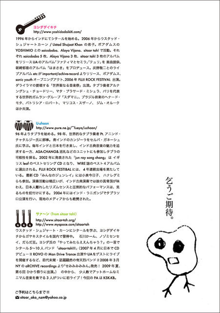 ウスタッド・シュジャート・カーンにシタールを学ぶ、ヨシダダイキチからガヤキスタイルを国内で習得中。石川かーん、ノゾミセンセイ、だらだ豆。ヨシダ氏の「やってみたらええんちゃう?」の一言で、シタール5〜10人バンド「sitaar-tah!!!」(2007年4月に日本でCDデビュー!! ROVOのMan Drive Trance出演やUAをゲストにライブを開催するなど、前代未聞・話題騒然の奇天烈バンド!! 2008年3月NYのaRCHIVE recordingsより「せみみみみみん」発売!2009年夏、第6回 ひかり祭りに出演。)の中から、少人数でアットホームなミニマル音楽を奏でる3人がついに初ライブ!今回のPAはKSK-KB。