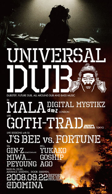体験したことのない強烈な低音、あくまでレゲエベースなコンシャスな質感。前回の来日時にも大きな衝撃を残した”THE KING OF DUBSTEP”、Digital MystikzのMALAが再来日。もはやDUBSTEPの世界ランカーとして地位を確立した盟友GOTH-TRADとともに名古屋の地下を骨まで揺らす。 21世紀の地下で熟成された、完全に新しく、完全にルーツに根ざしたダブミュージック。J'S BEEとFORTUNEのセッション、GIN-Zのホームグロウンサウンド、MIWAやPEYOUNGのフレッシュなダブ解釈で名古屋側も徹底応戦!