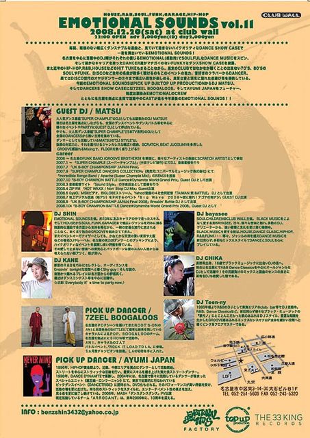 今回のEMOTIONAL SOUNDSはPICK UP DJにTOP UP PRODUCTIONからDJ MATSU、そしてDANCERS SHOW CASEには7ZEEL BOOGALOOS、そしてAYUMI JAPANをフューチャー、毎度お馴染みEMOTIONALのCREW とともに名古屋を拠点に全国で活躍中のCASTが送る今年最後のEMOTIONAL SOUNDS!!