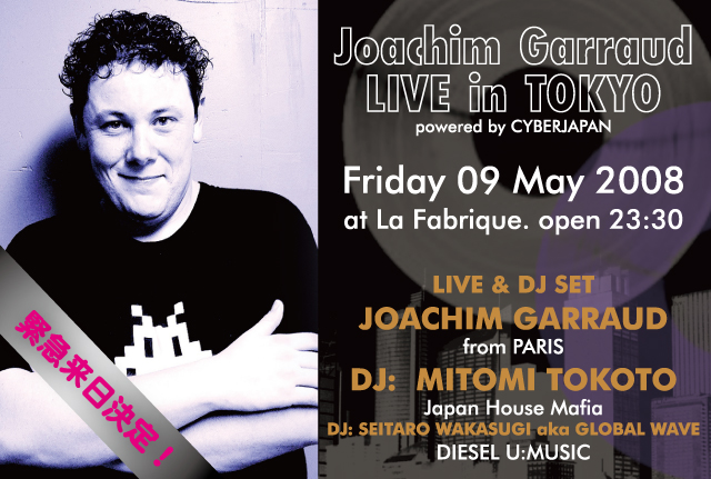 SPECIAL GUEST DJ Joachim Garraud http://www.joachimgarraud.com/ 2006年、Deep Dish"Flashdance" (Guetta & Garraud F*** Me I'm Famous Remix)でグラミー賞ベスト・リミクサー部門ノミネート。 David Guettaのリミクサーでもあり、プロデューサーでもあるJoachim Garrud(ジョアキム・ガロー)は、これ迄に数多くの世界的アーティストのプロデュース、リミックスを手掛けて来た。フレンチ・ハウスのパイオニアとしてキャリアをスタートし、フレンチ・サウンドをプロモートし続けてきた。2001年David Guettaのファースト・シングル『Just A Little More Love』は、数週間に渡ってフランスのクラブチャート1位を占拠。このシングルは、圧倒的な勢いで延々と続くグルーヴに、ナッシュヴィルの秘蔵っ子ソウル・ヴォーカルChris Willisの声によって甘い味付けをなされた、エレクトロとファンク・ハウスのカクテルである。懐かしささえ感じるメロディーやチープなエレクトロが多用され、80年代ダンス・ミュージックを現代のサウンドメイクで甦らせたかのようなわかりやすく洗練されたコンテンポラリーなサウンドは、フレンチ・クラブミュージックの独自性を我々に思い出させてくれる。スペシャルループ、リミックスプレイヤー、サンプラー等でのリアルタイムの製作・プロダクション。 100%CDで、もしくはラップトップコンピューターを用いたデジタルサウンドでのライブセットは、世界最高峰のテクニック! Joachim Garrudのプロデュースしたアーティスト: David Guetta, Kylie Minogue, Cassius, David Bowie, Ceronne, OMD, Kid Vicious, Paul Johnson , Bel Amour, Jean Michel Jarre等