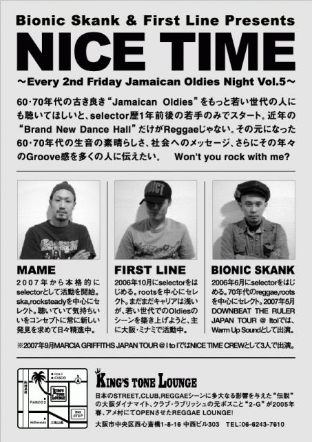 [ NICE TIME ] 60・70年代の古き良き“Jamaican Oldies”を もっと若い世代の人にも聴いてほしいと、 selector歴1年前後の若手のみでスタート。 近年の“Brand New Dance Hall”だけがReggaeじゃない。 その元になった60・70年代の生音の素晴らしさ、 社会へのメッセージ、さらにその年々のGroove感を多くの人に伝えたい。 Won't you rock with me?