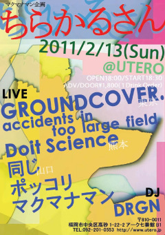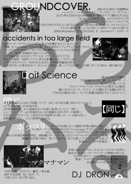 ○accidents in too large field 福岡アンダーグラウンドにいまなお多大な影響を与えているイベント「問題」をtepPohseenとともに主催。 Vo宇都氏のエフェクティブなボーカルに、ジャッキジャキのギター、あちこちに飛び跳ねまくっていたかと思えば、ブレイク一発急に直線的に向かってくるリズム。 その宇宙を感じさせるダンサブル且つフリーキーなライブは現存する福岡/全国のバンドに多大な影響を与えつづけている。 LESS THAN TVから「NEW BUILDINGS」を発表後編成を変え、ドラム担当だった清水氏がパーカッションに移行、新しいドラムを迎えより深いダンスの高みへ進み続ける。