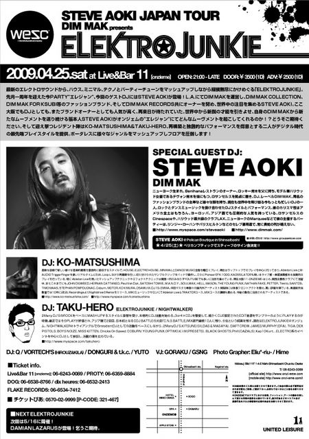 開催終了4月25日、STEVE AOKI出演イベント!!!WeSC and DIM MAK presents ELEKTROJUNKIE feat. STEVE AOKI @大阪心斎橋オンジェム