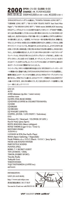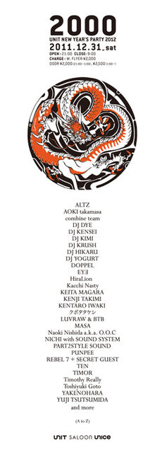 【UNICE】 DJ : combine (AQUIRA / kiccio / sin / YUYA ) DJ YOGURT (UPSETS) Kacchi Nasty (Jazzy Sport) Naoki Nishida a.k.a. O.O.C (Shack / O.O.C / Jazzy Sport) NICHI with SOUND SYSTEM PART2STYLE SOUND TIMOR (DUBBY SPORT) Timothy Really (Kon aka Tomotsugu Kondo / Tosi aka mickee ) Toshiyuki Goto (A to Z)