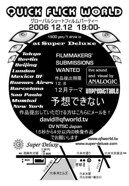20時:世界10都市の上映。先月のテーマ:LUCKY(運がいい) 20:00 Global Showcase Screening from the 10 QFW cities. Last month's theme: LUCKY 21時:ライブパフォーマンス ANALOGIC 21:00 Live Performance! 22時:東京の作品上映。今月のテーマ:UNPREDICTABLE (予想できない) 22:00 Tokyo Showcase Screening. This month's theme: UNPREDICTABLE!