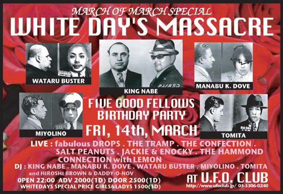2008年 3月14日(金) マーチ・オブ・マーチ・スペシャル 「ホワイトデーの虐殺」 〜 KING NABE , MANABU K. DOVE , WATARU BUSTER , MIYOLIN0 , TOMITA , SHIMADA ,3月生まれの誕生パーティーです 〜