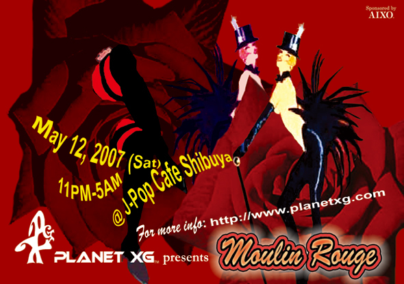 [Planet XG] presents "Moulin Rouge" (International Queer Mix) Date:2007.5.12. (Sat) 11pm-5am Dress Code: please enjoy your creation and selecting your cloths with something Red for The Moulin Rouge (Guests in red color 80% and more of your entire attire, or in really gorgeous red attire, a welcome drink of sparkling wine (Freixenet) will be offered to the first 30 guests ! ) Venue:J-POP CAFE SHIBUYA ADDRESS: BEAM Bldg.7F, 31-2,Udagawa-cho,Shibuya-ku,Tokyo,Japan SHIBUYA TEL:03-5456-5767 Sponsored by AIXO:Supported by Suntory,Lucia Now the Planet XG club event is Coming Back on this May 12 again for the first time in a year! which is the festival of love, beauty (aesthetics) and Art, the entertaining dream night for avant-garde adults with highly aesthetics, especially featuring about love and beauty (aesthetics) made through artistic expressions (in an avant-garde way) in the space without boundaries especially among Art, cultures, and sex. a cavalcade of gorgeous shows all through the night! For more detail of the event:http://www.planetxg.com/r_e_event05122007.html Perfoming artists: ■CanCan Girls *Belly Dancers: Alf Leyla Wa Leyla ■Fire performer/ Belly dancer: Mido ■Drag Queen: Miss Havana Fair (From Australia) ■Comedy Drag King: Bjorn ■Performing Artist: Vampire Crea (without genders, nationalities etc.,) ■SM/ Fetish Ballet Dancer: Dragon ■Beautiful Mistress: Rinko ■Androgyny Performing art: Sepha on PXG! ■a Siger from Jazzy Music Unit, Underground CAFE: Marco ■Chanson Singer: Haru ■Soprano Singer: Makiko Fujita (sings opera in costume collabrated with couture leather fashion brand, AIXO) ■DJ YOUNG RICHARD (from NY) ■VJ EDYF ■couture fashion brand: AIXO For more detail of the artists: http://www.planetxg.com/r_j_artist_5122007a.html AND may be MORE... ★5000 yen with 1 Drink on the night ★4500 yen with 1 Drink (with flier or PXG members)