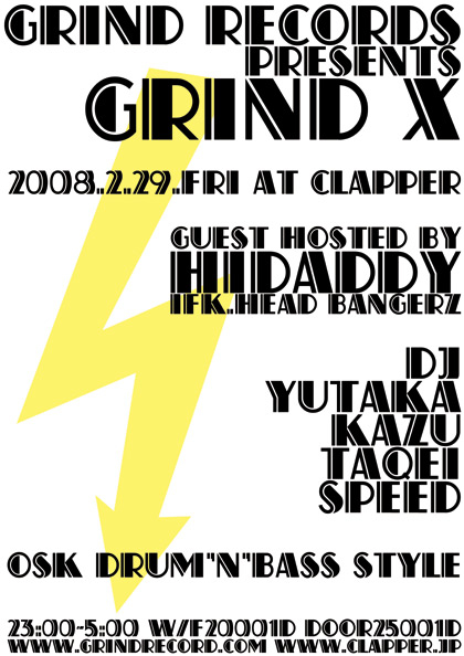 前回のSTATE OF MINDツアーも大盛況で幕を閉じた[GRIND X]。今回はHIPHOPサイドより、今や日本を代表する韻踏合組合からHIDADDYを招き4年に1度の閏年の日に開催!フリースタイラーの最高峰[ULIMATE MC BATTLE]に大阪予選を見事勝ち抜き、3年連続でファイナル進出。また、8ミリカメラ片手に北は北海道、南は沖縄のラッパー総勢100人以上とフリースタイルでリンクしたDVD、「ヒダディ一人旅」をリリース。正に飛ぶ鳥を落とす勢いのHIDADDYがDRUM&BASSでホストする音と言葉によるJUNGLE BASS NIGHT決定版!!見逃すわけにはいかないー