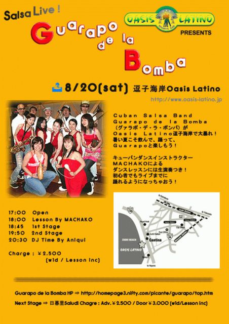 ☆2005/08/20 逗子Oasis Latino ¥2,500(Lesson/1drinkつき) 17:00 Open 18:00 Lesson By MACHAKO(ラスト15分ほど生演奏つき!) 18:45 1st Stage 19:50 2nd Stage 20:30〜Last DJ Time By Aniqui