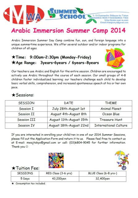 Arabic Immersion Summer Camp 2014!! The bus is gassed up and ready to go! Summer Fun at Arabic Immersion Summer Camp 2014 will be held in Yoyogiuehara right behind the Tokyo Camii this summer. We have a Full-day Summer Camp starting July 28th, consisting of four one-week sessions, 9:00am-14:30pm from Monday through Friday for children aged 3-8 years old. Each session has its own theme, which at each day we will provide a wide variety of activities such as Hands-on Arts and Crafts, Time at the Park, Phonics Learning and much more. Come and join the Summer, let your child get exposed to Arabic and English with children from different cultures, a great opportunity for language and culture exchange as well as a great deal of FUN! In addition, we are now accepting the entrance application for PreK, Kindergarten, Afterschool and Saturday School classes for this coming September. If you are interested in enrolling your child/ren in one of our 2014 Summer Sessions of if you need any further information, please feel free to contact us at: mwajtokyo@gmail.com .
