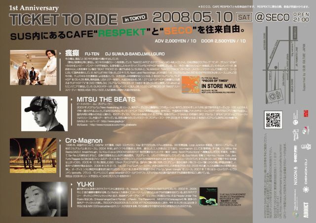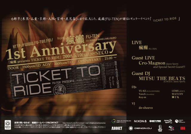 『 TICKET TO RIDE in TOKYO』も遂に今回で一周年を迎え、豪華ラインナップで開催。 今回も"瘋癲 (FU-TEN)"はもちろん、"Jazzy Sport"より2007年7月にはヨーロッパツアー成功させたばかりの"Cro-Magnon"に加え、昨年待望の3rdアルバムをコロムビアミュージックよりリリースし全国ツアーを行っている"GAGLE"から"DJ MITSU THE BEATS"がゲスト参加し、今回も音楽だけではなく、最大6面のスクリーンをフル活用したVJ "de-sheevo"による映像演出等、実際にイベント当日足を運んだ人にしか体感できない空間を演出している。