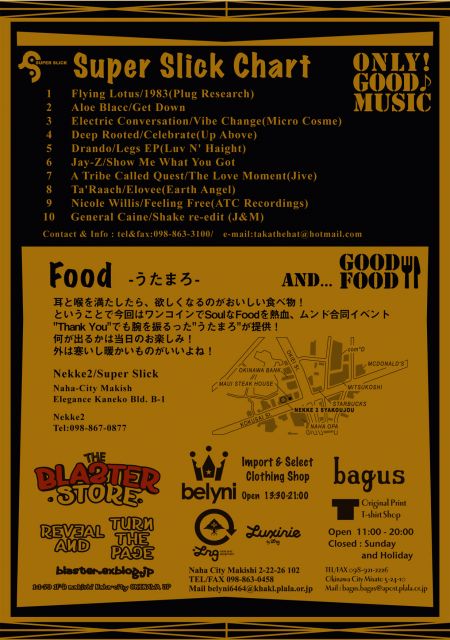 全てに深い本当のAll Mix Player the bd、その豊富なDjキャリアで本物のオールラウンドなプレイを聴かせる現在の沖縄アンダーグランドシーン最重要人物の1人Miyashita,Marva Witney,Rhymster,Scha Dara Parの来沖公演で前座を務め,フロアをロックし続ける若きFunk/Old School Master KOG,KoolでCoreなFunkness,沖縄で最も人気があるDjの1人Dj Jun,唯一無二のプレイで新世代のSoul/Jazzの解釈を見せつけるTakumax,これからの沖縄Funk/Soul/Jazzシーンを引っ張っていくであろう若き女性Super Digger Yae!