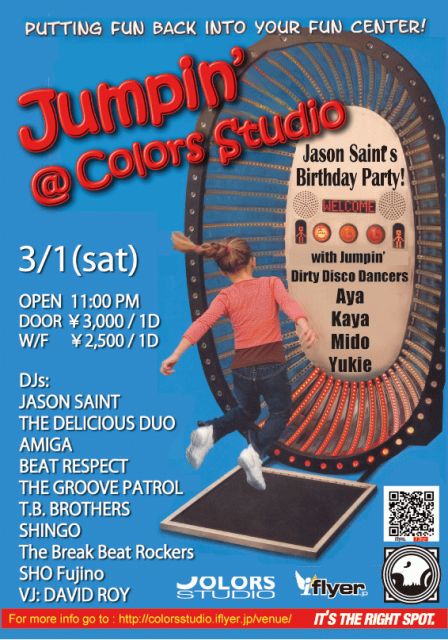 [VJ] DAVID ROY http://www.myspace.com/davidroy001 [Dancers] Jumpin’ Dirty Disco Sexy Dancers - Aya, Kaya, Mido, Yukie [DOOR] 3,000 Yen / 1D 2,500 Yen / 1D >>> with FLYER or print out email or say “iflyer” at door! 2,500円 / 1D >>> メールプリントアウトか、入り口で「iflyer」の合言葉でディスカウント! [More info] 2,000 Yen / 1D >>> send full name (First and Last) by email before March 1, 12:00 pm to : vip@jumpin.jp 2,000 Yen / 1D >>> 3/1, 12:00 pm 迄にフルネーム(氏名)を vip@jumpin.jp 宛にemail ください。
