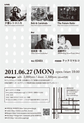 その野暮ったい風貌から放たれる泥臭さ・人間臭さに満ちた生活を歌う音楽を誰もが愛せずにはいられない!パワフルで滑稽なライブが各方面から大絶賛を浴びている《夕暮レトロニカ》、フィッシュマンズやbonobos好きは必聴!極上のメロディーと腰にくるグルーヴでグッドミュージックを奏でる5人組《Bob & Carnivals》、2011年春、throwcurveの活動凍結と同時に誕生!RatsoN(=中村遼)氏率いるニューウェイヴ音楽創作集団《The Future Ratio》、とNew Action!初登場の3アーティストが出演します。