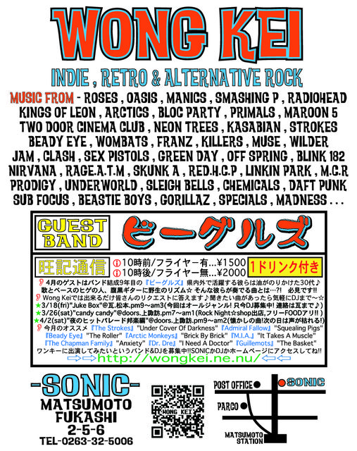 流れる曲は。。。 ROSES , OASIS , MANICS , SMASHING P , RADIOHEAD KINGS OF LEON , ARCTICS , BLOC PARTY , PRIMALS , MAROON 5 TWO DOOR CINEMA CLUB , NEON TREES , KASABIAN , STROKES BEADY EYE , WOMBATS , FRANZ , KILLERS , MUSE , WILDER JAM , CLASH , SEX PISTOLS , GREEN DAY , OFF SPRING , BLINK 182 NIRVANA , RAGE.A.T.M , SKUNK A , RED.H.C.P , LINKIN PARK , M.C.R PRODIGY , UNDERWORLD , SLEIGH BELLS , CHEMICALS , DAFT PUNK SUB FOCUS , BEASTIE BOYS , GORILLAZ , SPECIALS , MADNESS . . .