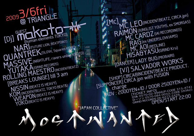 2009年始動!! 前回のLONDONELEKTRICITY&MC WRECを招いたMOST WANTEDでは、確実に次に繋がった内容で大阪、いやっ全国に電波を飛ばした一夜を披露した。 そのMOST WANTED第二弾がいよいよ開幕!! 今回は、大阪を軸に東京、神戸、京都の4都市から未来に向けて活躍するDRUM&BASS DJ/MC達が集結!! ゲストは、PRODUCER/DJとして世界から絶大な支持を受け日本で唯一世界ツアーも成功させ、聞く人全て魅了させる東京在住、human elementsからDJ MAKOTOを迎える! 大阪からは、 BASSLINE STRIKERことNARI a.k.a Future Lion, GRIND RECORDSからDJ YUTAKA, 拠点を大阪に戻したROLLING MAESTRO! 最近、認知度を急激に高める噂の神戸からQUANTREK。 京都からは、この人でしょう!選曲、テクニックとダンスフロアを動かす凄腕DJ MASSIVE!! そこに迎え撃つMC陣、MC LEO, JUNGLIST YOUTHS, 元スモーガスのVO.を努める来門=RAIMON!! IAI RECORDINGSからMC CARDZ, 元UNDERSLOWJAMSのVO.で活躍しソロでもかなりの実力派MC, RAG! そして、大阪最重要MCs, MC AOI, HISA&YASU。 ダンサーはもちろんCUTEな二人組MIO&AIRIからなるLADY BUG!! STREET VJ STYLEで音と人をリンクさせるSALVADOR WORKS!! 新しい試みを得たBREAKS LOUNGEでは、NISSIN率いるBEATZ IS HEAVYクルーが参戦!! 日本人のみで構成され、DJとMCが始まりから終わりまで止まる事無くメイクするONE NIGHT GROOVE PARTY "JAPAN COLLECTIVE"は最高にフレッシュでクレイジーな夜になるだろう! Very Welcome to MOST WANTED!!!!!!!!!!!!! ーーーーーーーーーーーーーーーーーーーーーーーーー ★チケットINFO★ *ぴあ 0570-02-9966 (P-CODE 315-474) *ローソン 0570-084-005 (L-CODE 59362) *GRIND RECORDS 06-6245-2439 までお問い合わせ下さい。 ーーーーーーーーーーーーーーーーーーーーーーーーー