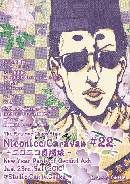 DJ AOiRO_Manbow a.k.a.hapi⇒(Salvation by Faith Records) DJ E-ROGiC DJ 五条狐萩(天燈通信社 / AVSS) DJ サオリリス DJ やっしー(かれいどすこ〜ぷ) DJ 夜叉(NC EAST Resident) DJ Takuma(NC Organizer) VJ あにき(かれいどすこ〜ぷ) VJ よし(Bind Contact/アニ鍋) HOST MC UTAのお姉さん(音召缶) Supported by e.se Records ---------------------------------- ちなみに主催Takumaから、未成年者の飲酒喫煙は禁止するとの連絡があった。 酒を飲みたいお主らは、生年月日を記載した、身元を証明するモノを持参するように依頼されておる。バーカウンターで提示することを忘れるでないぞ。