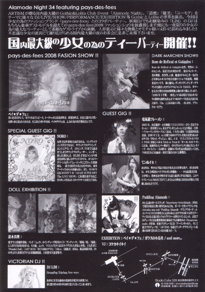 ARTiSMが贈る国内最大級のGothic&Lolita Club Event「Alamode Night」。「退廃」「優美」「ユーモア」をテーマに様々なDJ/LIVE/SHOW/PERFORMANCE/EXHIBITION等GothicとLolitaの世界を演出。今回は少女の為のファッションブランド「pays-des-fees」とのコラボパーティー。妖精DJでもお馴染みの「LIM」のDJはもちろん豪華ゲストモデルを迎えてのpays-des-fees2008ファッションショウを披露致します!他にも一夜限りの少女の為の盛大なパーティーとして素敵なゲストライブから演劇、人形展示に様々な物販とオモチャ箱いっぱいに詰め込みました!!不思議な少女の迷宮にて繰り広げられる国内最大級の夜のお茶会に是非ご来場下さいませ。