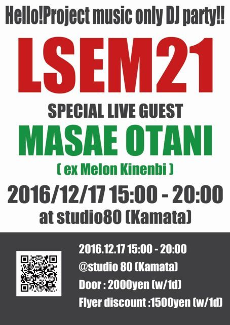 [LSEM 21] date : 2016.12.17 (サタデナイッ!!) Open - close : 15:00 - 20:00 Door : 2000yen (w/1drink) Flyer discount : 1500yen (w/1drink) place : studio 80 @ kamata ※フライヤー割引あります!!!