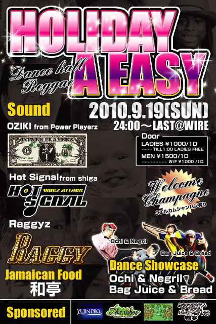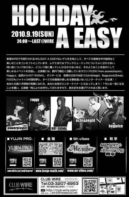 新宿で今回行われるHOLIDAY A EASYはレゲエを主体として、すべての音楽を年代関係なく楽しむことをコンセプトとしています。 レゲエまたはブラックミュージックについてよく分からない、特に曲について知らない、どういう風に踊っていいか分からないなど、そのようなことを抜きにして楽しめるイベントを目指し、出演者には都内で幅広く活躍しているサウンドOZIKI from powerplayerz、Raggyz、滋賀からHOT SIGNAL、ダンサーには関東の次世代を担うOchi&Neglil、Bagjuice&Bread、Foodもジャマイカ料理和亭と、すべてのお客様が楽しめること間違いないエンターテイナーが出演!! あなたの過ごす時間が笑顔になれる、あなた自身がエンターテイナーにもなってしまう!? そんな一夜になることを願い、出演者一同心よりお待ちしておりますので、是非足をお運びくださればと思います。