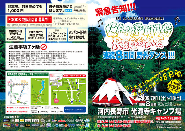 totalinfo DI GARDEN(06-6788-8889) 貸しテント、バンガロー、シャワー、トイレ、全て有ります。 勿論、近場の方は毎日帰っても何回でも又入れます。 持ち込み禁止! バーベキューなどは会場外でお願い致します。(綺麗な川、沢場がいっぱい有りますよ。) 釣りは会場内でも出来ます。ゴミは各自のケジメでお願い致します。 連日朝日が昇るまでやってます♪