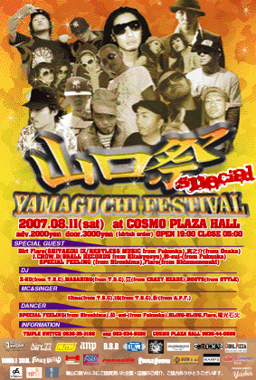 詳細は SPECIAL GUEST DJ Dirt Flare SHITAKILI?/RESTLESS MUSIC from 福岡 SINGER 真之介 from大阪 J.CROW.D 9 BALL RECORDS from北九州 酔〜sui〜 from福岡 SPECIAL FEELING from 広島 Flare from 下関