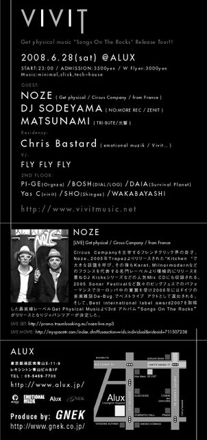 第2回目を迎えるVivitは、Sonar Festivalなど数々のビックフェスティバルでのパフォーマンスで、 2006年ドイツの音楽雑誌De-Bug.でベストライブ アクトとして選出されたフレンチクリック界の奇才“NOZE”が登場!!Get Physical Musicより3rd アルバム“Songs On The Rocks”をリリースし、今回ファン待望の初来日ツアーが決定。