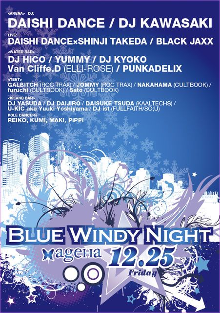 豪華な出演陣と装飾で7月、9月にageHaにて開催されたBLUE WINDY NIGHTの3度目の開催が決定!クリスマスに開催される今回は、今や日本を代表するDJの一人となったDAISHI DANCEとハウス/クロスオーバー界の最重要人物DJ KAWASAKIがARENAに登場。2人のDJに加え、俳優でもありサックスプレーヤーのSHINJI TAKEDAが同郷であるDAISHI DANCEと夢の競演を果たす。さらにLIVEアクトとしてBLACK JAXXの参戦も決定!!