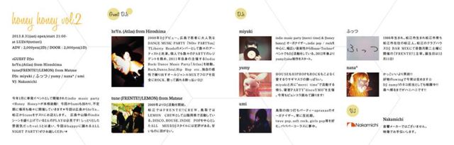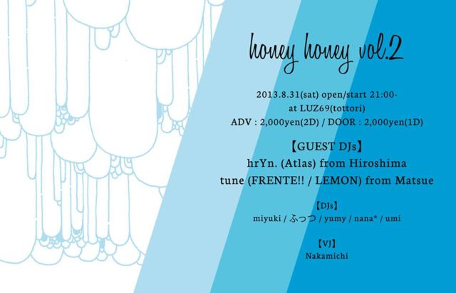 今年1月に単発イベントとして開催されたindie music party<honey honey>が本格始動!今回からumiも加わり、不定期に場所も様々に開催していきます*今回は広島からhrYn.、松江からtuneをゲストにお迎えします。広島や山陰のindieシーンを盛り上げている2人のPLAYは必見です!しっとりとした雰囲気だったvol.1とは違い、今回はhappyに踊れるALL NIGHT PARTY!ぜひお越しください*