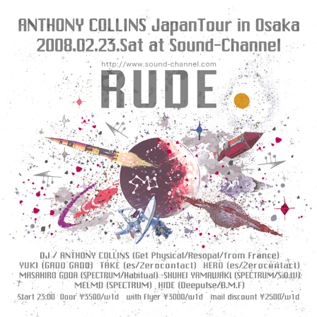 RUDE -ANTHONY COLLINS Japan Tour in Osaka- 2008.02.23.Sat @Sound-Channel http://www.sound-channel.com/ Start 23:00 Door \3500/w1drink with Fryer \3000/w1drink mail discount \2500/w1drink (rude20080223@gmail.comにお名前(フルネーム)と人数を送信して下さい。後日入場方法が書かれたメールが返信されれば登録完了です。08年2月22日をもちまして締め切らせて頂きます。)
