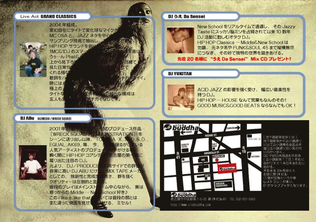 90's Hip-Hop中心に、OLD〜MIDDLE〜NEW SCHOOLはもちろん、 元ネタ系〜RARE GROOVE〜ACID JAZZ〜SOUL〜FUNKなど All Funky Black Music PartyがまたまたBuddhaに登場!