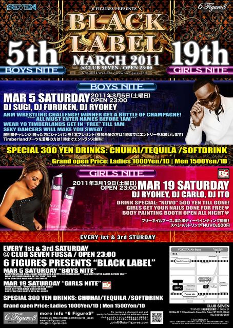 4/2 SAT 6 FIGURE$ presents BLACK LABEL -BOYZ NITE- @ club SEVEN in Fussa (near Yokota AB) DJ SUGI DJ FURUKEN DJ RYOHEY GOGO DANCERS:EYE CANDY MC: DEE POET Door: Grand Open Price Ladies 1000Yen/1D & Men 1500Yen/1D
