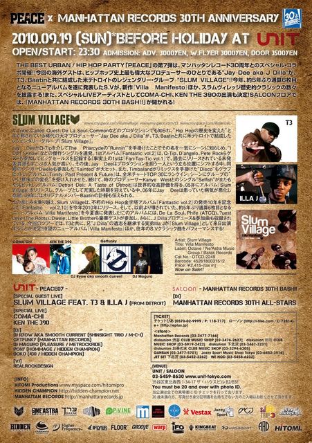THE BEST URBAN / HIP HOP PARTY「PEACE」の第7弾は、マンハッタンレコード30周年とのスペシャル・コラボ開催!!今回の海外ゲストは、ヒップホップ史上最も偉大なプロデューサーのひとりである"Jay Dee aka J Dilla"が、T3、Baatinと共に結成した米デトロイトのレジェンダリー・グループ "SLUM VILLAGE"!!今年、約5年ぶり通算6枚目となるニューアルバムを遂に発表したS.Vが、新作『Villa Manifesto』ほか、スラムヴィレッジ歴史的クラシックの数々を披露する!また、スペシャルLIVEアーティストとしてCOMA-CHI、KEN THE 390の出演も決定!SALOONフロアでは、「MANHATTAN RECORDS 30TH BASH!!」が開かれる! -- PEACE x MANHATTAN RECORDS 30TH ANNIVERSARY http://www.unit-tokyo.com/schedule/2010/09/19/100919_peace.php