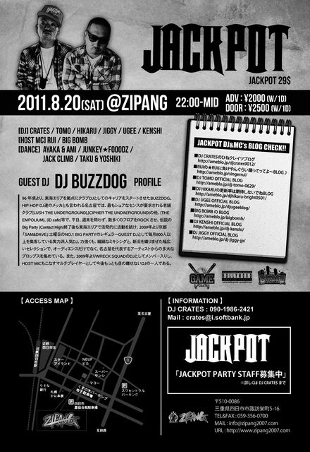 96 頃より、東海エリアを拠点にクラブDJとしてのキャリアをスタートさせたBUZZDOG。 HIP HOP DJ達のメッカとも言われる名古屋では、最もシュアなセンスが要求される老舗クラブ[LUSH THE UNDERGROUND],[CIPHER THE UNDAERGROUND]の他、[THE EMPOLIUM]、[iD cafe]等で、平日、週末を問わず、数多くのフロアをROCK させ、伝説のBig Party [Contact High]終了後も東海エリアで活発的に活動を続け、2009年より京都 「SAM&DAVE」土曜日のNO.1 BIG PARTYのレギュラーGUEST DJとして毎月800人以上を集客している実力派人気DJ。力強くも、繊細なミキシングと、新旧を織りまぜた幅広いセレクションで、オーディエンスだけで なく、名古屋を代表するアーティストからの多大なプロップスを集めている。 また、2009年よりWRECK SQUADのDJとしてメンバー入りし、HOST MICもこなすマルチプレイヤーとして今後もっとも目の離せないDJの一人である。