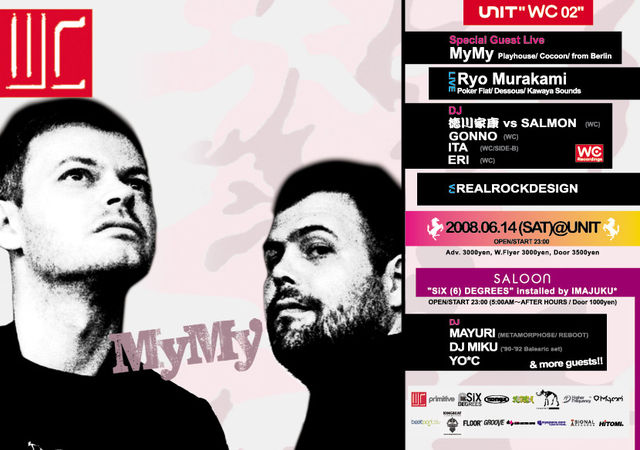 "WC" (www.myspace.com/wcrecordingsparty) [UNIT] -WC02- -Special Guest LIVE- MyMy (Playhouse/ Cocoon/ Berlin) -LIVE- RYO MURAKAMI (Poker Flat / KAWAYA Sounds) -DJ- IEYASU TOKUGAWA v.s. SALMON (WC Recordings) GONNO (WC Recordings) ITA (WC Recordings / SIDE B) ERI (WC Recordings) -VJ- REALROCKDESIGN