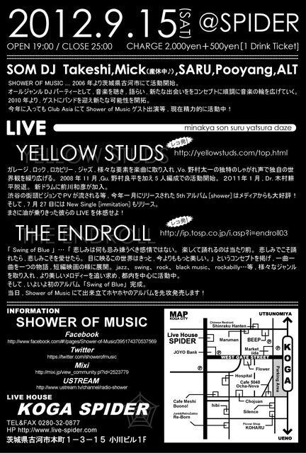 そして今年1月に5thアルバム<shower>をリリース(タイトルからして縁を感じますねw)したYellow Studs。渋谷の街頭ビジョンでPVが流される等、メディアからも大好評!ホントにかっこいいアルバムです!7月27日にはNew Single<immitation>もリリースしまさに油の乗り切った状態のライブを体感できます!