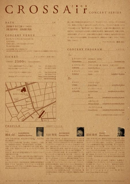ドイツ・エッセンにあるフォルクヴァンク音楽大学で共に学ぶ、ピアニスト・富田珠里と、アコーディオニスト・大田智美が、2006年夏からスタートさせたソロ&室内楽コンサートシリーズ『CROSSAir』。今年は三年目を迎えます。