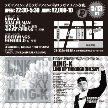 今回は長野からSOUND YAMABICOとDEE-JAYのAPPLE EYE、SHOWSPRINGがOPEN初登場です。 長野の熱いRAGGAMUFFIN。RECORD PLAYと2人のDEE-JAYを見逃すな!!!