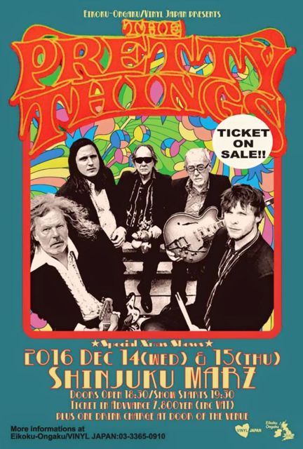 ☆【THE PRETTY THINGS】来日公演の前売チケットがプレイガイドON SALE NOW 再来日にして最後の来日公演まで2週間ちょっと!! 【THE PRETTY THINGS】来日公演の前売チケットがローソン、e+でもON SALE NOW。 詳細をご案内いたします。 --------------------------------------------------------- 英国音楽/VINYL JAPAN presents 【THE PRETTY THINGS】 2016 Dec 14(wed) & 15(thu) 新宿MARZ L-CODE:70214 Doors Open 18:30/Show Starts 19:30 Ticket in advance 7,800yen (inc VAT) plus one drink charge at door of the venue More informations at 英国音楽/VINYL JAPAN:03-3365-0910