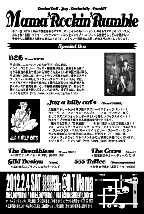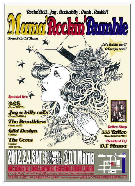 ★毎年7月に開催されるママロッキンナイトの冬バージョン その名もママロッキンランブル、おしゃれ・お酒・ タトゥー・ロッケンロー・パンクをコンセプトにパワフルな 音楽そしてどこか懐かしい音楽そんな雰囲気をお楽しみください。 Special Live いこち (From tokyo) Jug a billy cat's (From oosaka) The Breathless (From mie) Gild Design (Local) The Coors (Local)