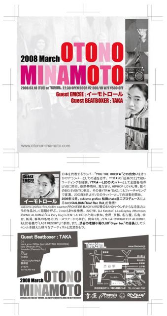イーモトロール PROPFILE: 渋谷Organ bar--を中心に活動するラッパー。 96'地元の千葉でひっそりDJ活動を開始。 上京後、日本を代表するラッパーYOU THE ROCK★との出会いをきっかけにラッパーとしての道を志す。 YTR★の「超楽CEZ」で初レコーディングを経験。 YTR★--L2Dのメンバーとして全国各地のLIVEに同行。亜熱帯雨林、鬼だまり、HIPHOP LOYAL等、数々のBIG EVENTに参加。 その後YTR★「DAZ」にもフィーチャリングで客演。 2003年6月よりソロのラッパーとしての活動を開始。 煙突つレコーディングより発表された「煙突つサンプラー VOL.2」の[ORGAN BAR ON MANDAYS]にYTR★、SHIBA-YANKY,D.O,EL AMAZONと共に参加。 LONDON NITEのDJ,Katchin'a.k.a.Dogday Afternoonの1ST ALBUMに初ソロ曲、[Rebel Music Affair]を提供。 LONDON NITE X'mas Special @クラブチッタにも出演。 翌年発表された「JAPANESE RAP STA」では、[USUAL DAYZ]にN-TOWN DOGGZのJASHWON、PIT-GObと競演。 cubismo grafico fiveのLIVEに飛び入り出演、それを機に2006年12月、cubismo grafico 松田chabe岳二プロデュースによる1stソロALBUM「Niw! Rec Roll」を発表!! cubismo grafico five,riddim saunter,FRONTIER BACKYARD等のBANDサウンドからなる強力コラボ作品として話題を呼ぶ。 7inchも計4枚発表。 2007年、DJ Katchin' a.k.a.Dogday Afternoonの2ND ALBUMの「Ca Paty Da」にZEN-LA-ROCKと共に参加。 金沢、京都、名古屋、広島、仙台、新潟、群馬の各地のリリースツアーにも同行。 同年7月、ZEN-LA-ROCKの1ST ALBUMにもL2D名義で「LAST RESORT」に参加。 また、渋谷の老舗小箱CLUB Organ bar.の店長としてジャンルを越えた様々なアーティストと交流をもつ。