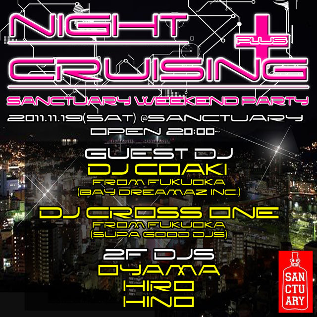 Pick Up Party!! 4日(金)「FLOOWER」Pick Up DJ SHOGO(SUPA GOOD DJs) 5日(土)「NIGHT CRUISING+」Guest DJ GEORGE 7日(月)「BLACK MONDAY」@VIBE 11日(金)「FLOOWER -DJ HIRO BIRTHDAY BASH!-」Pick Up DJ MORIO 18日(金)「HIT PARADE」@SANCTUARY 5F 19日(土)「NIGHT CRUISING+」Guest DJ COAKI,CROSS ONE 24日(木)「Winning Eleven SANCTUARY CUP」@SANCTUARY 3F